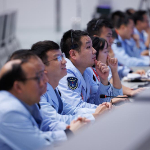 11月1日,在北京航天飞行控制中心飞控大厅,参试人员在监测交会对接进展。