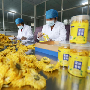 11月5日,在甘肃省定西市临洮县一家菊花加工企业,工人包装金丝皇菊。