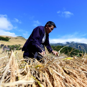日前,广西桂林市龙胜各族自治县龙脊镇大寨村种植的水稻进入收获季节,梯田之上呈现出一派忙碌的景象。