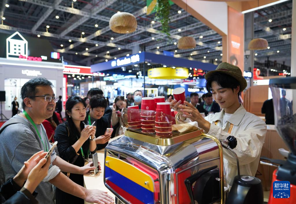 11月5日,人们在第八届进博会国家展哥伦比亚馆排队品尝咖啡。