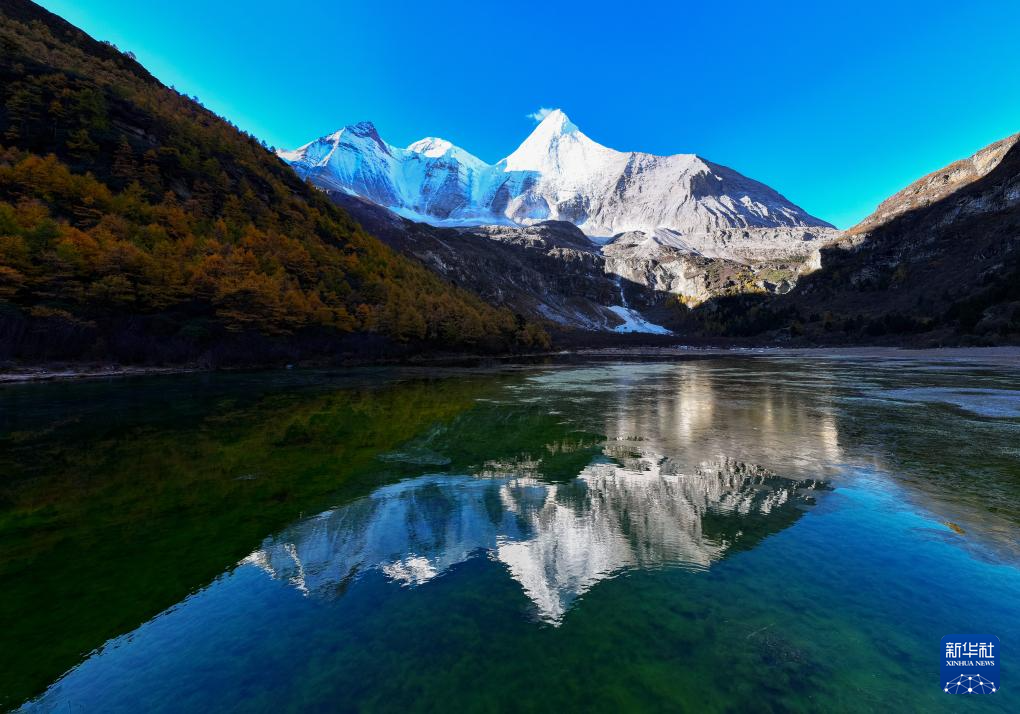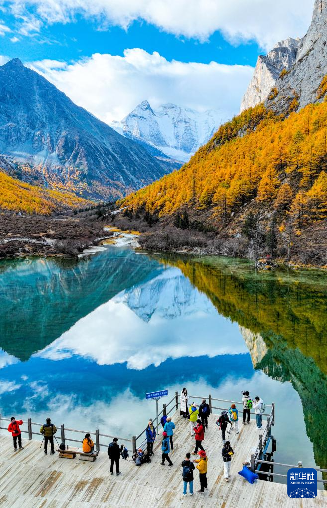 蓝天白云、雪山和彩林倒影在稻城亚丁景区圣水湖中(10月29日摄)。