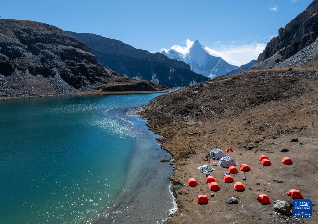 在稻城亚丁景区波拥措,湖边搭着徒步爱好者的帐篷(10月28日摄,无人机照片)。
