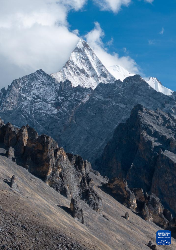 远眺夏诺多吉雪山,蓝天白云、雪山与彩林相互映衬(10月26日摄)。