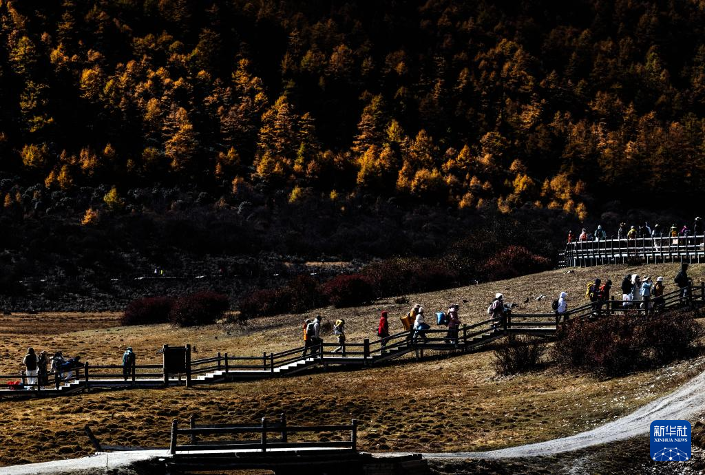 游人走在稻城亚丁景区洛绒牛场步行栈道上(10月29日摄,无人机照片)。