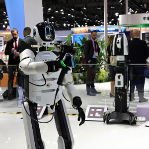 11月5日,一个海克斯康AEON工业人形机器人在展台上进行三维扫描作业演示,这也是该型号机器人工业自动化应用场景的中国首展。
