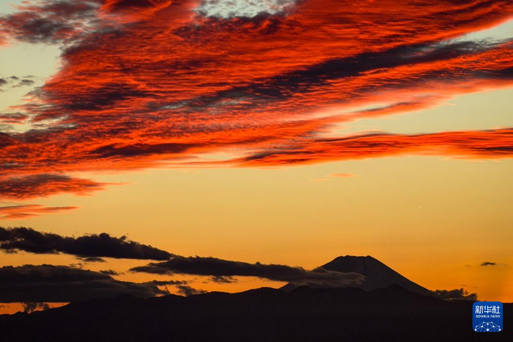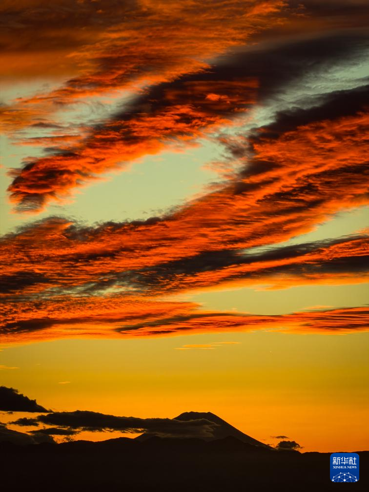 这是11月6日傍晚在日本东京拍摄的火烧云与富士山(手机照片)。