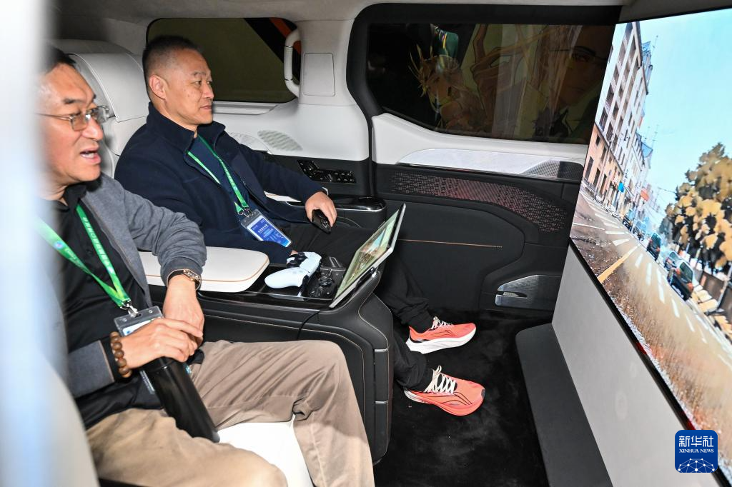11月8日,在第八届进博会技术装备展区索尼展位,观众在沉浸式座舱内体验索尼车载娱乐系统。这款车载娱乐系统可艺术化渲染车窗外动态景观,提升乘客的出行体验。
