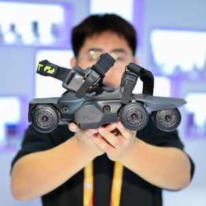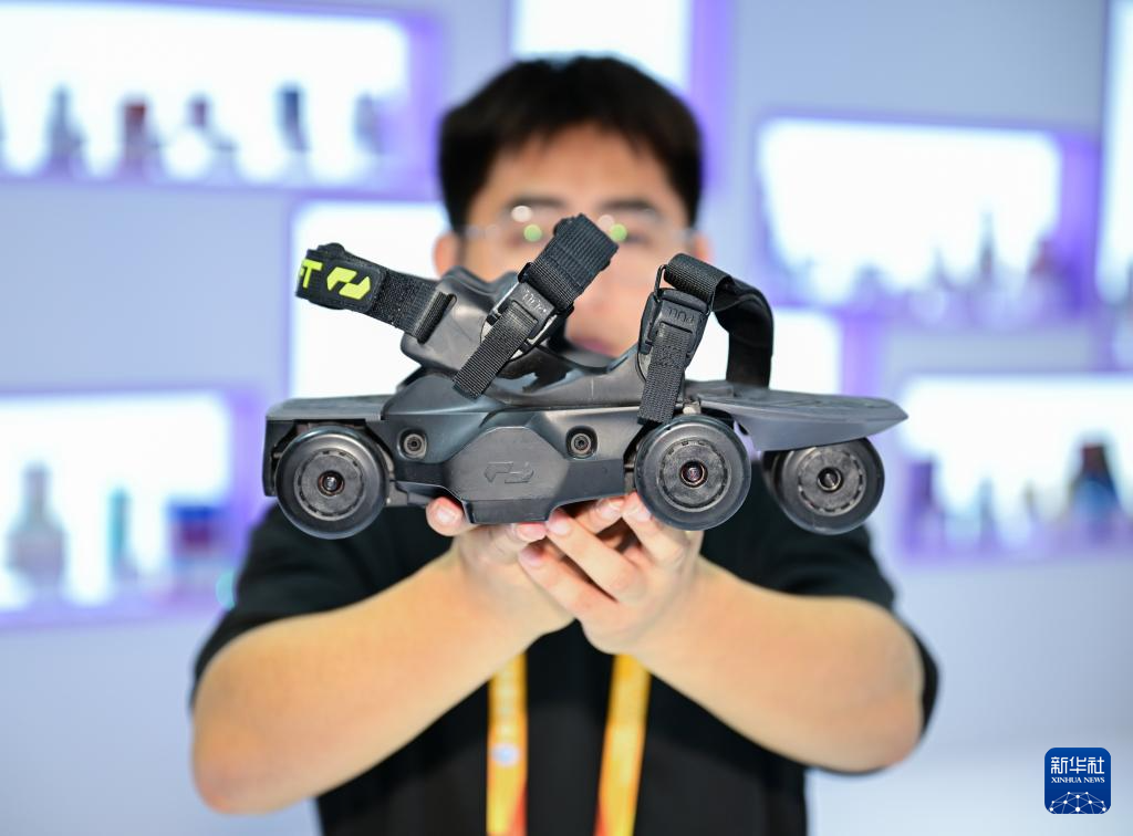 11月8日,在第八届进博会消费品展区天猫国际展位拍摄的一款轮式外骨骼机器人。这款外骨骼机器人可以套在普通鞋子上用于提升步行速度。