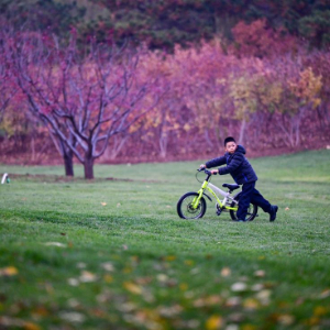 11月8日,一个小朋友推着单车走在北京雁栖湖畔的草坪上。