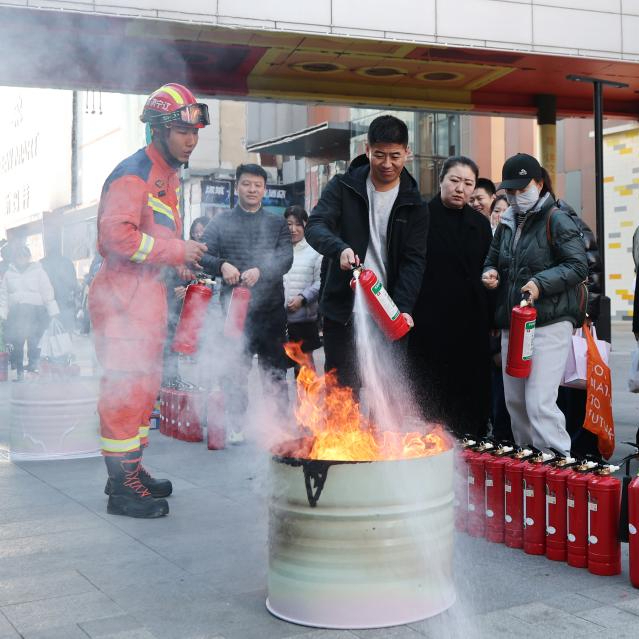 11月9日,在沈阳市中街商业步行街,市民参加灭火演练。