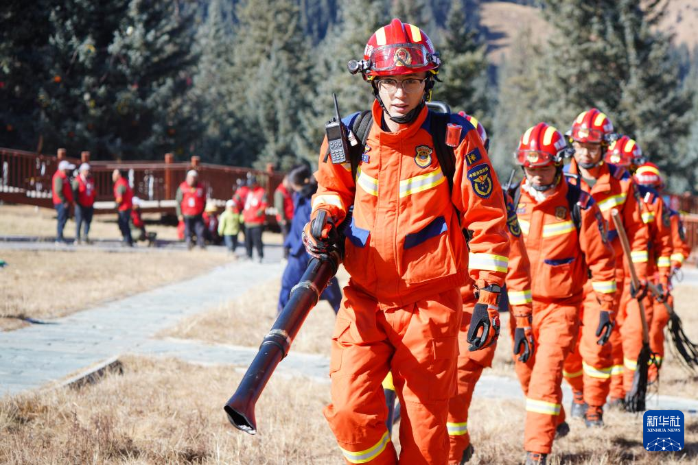 11月8日,在青海省海北藏族自治州祁连县阿咪东索林区,祁连县消防救援大队消防员准备向护林员演示森林草原灭火装备的操作方法。