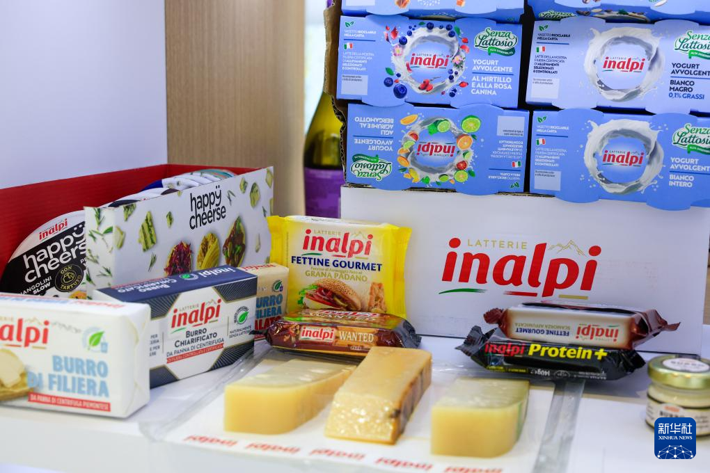 这是11月9日在第八届进博会农食产品展区拍摄的意大利伊纳尔皮集团(Inalpi)的产品。