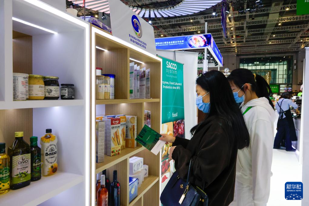 这是11月9日在第八届进博会农食产品展区拍摄的意大利食品与饲料出口促进会展台一角。