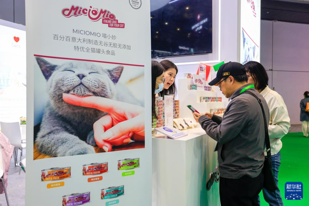 11月9日,在第八届进博会农食产品展区,人们在一家意大利宠物食品品牌的展台咨询。