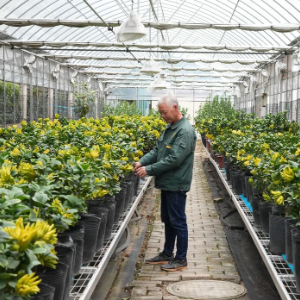 11月11日,在位于婺城区白龙桥镇的一家佛手种植企业,工作人员在整理佛手盆栽。