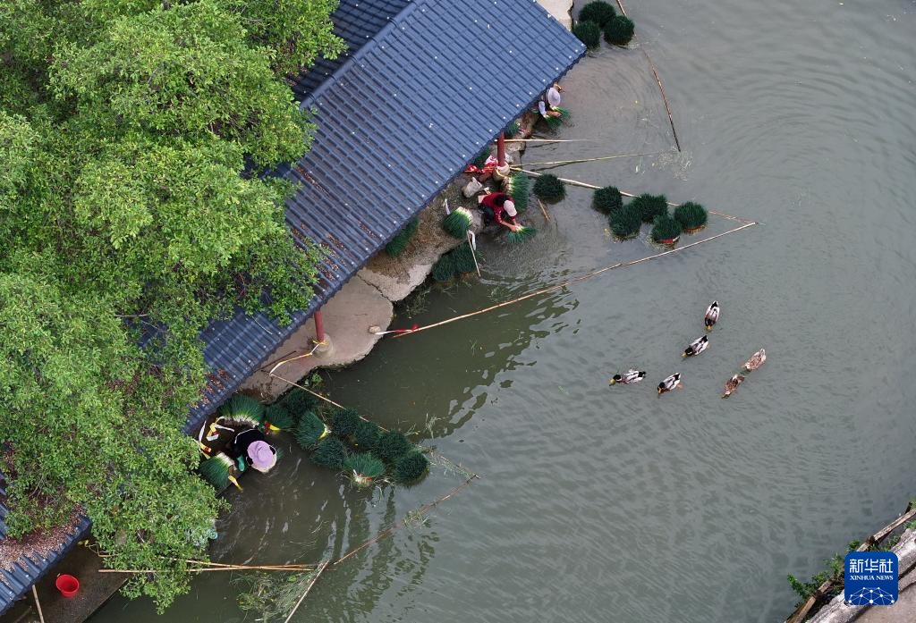 柳州市柳江区三都镇觉山村村民们在小河里洗香葱(无人机照片,10月21日摄)。