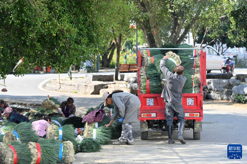 柳州市柳江区三都镇觉山村村民将挑选好的香葱搬运上车,准备销售(10月28日摄)。
