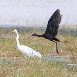 在海南昌江海尾国家湿地公园拍摄的彩鹮(右)与鹭鸟(11月5日摄)。