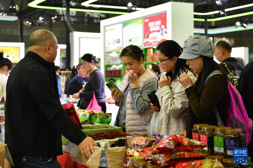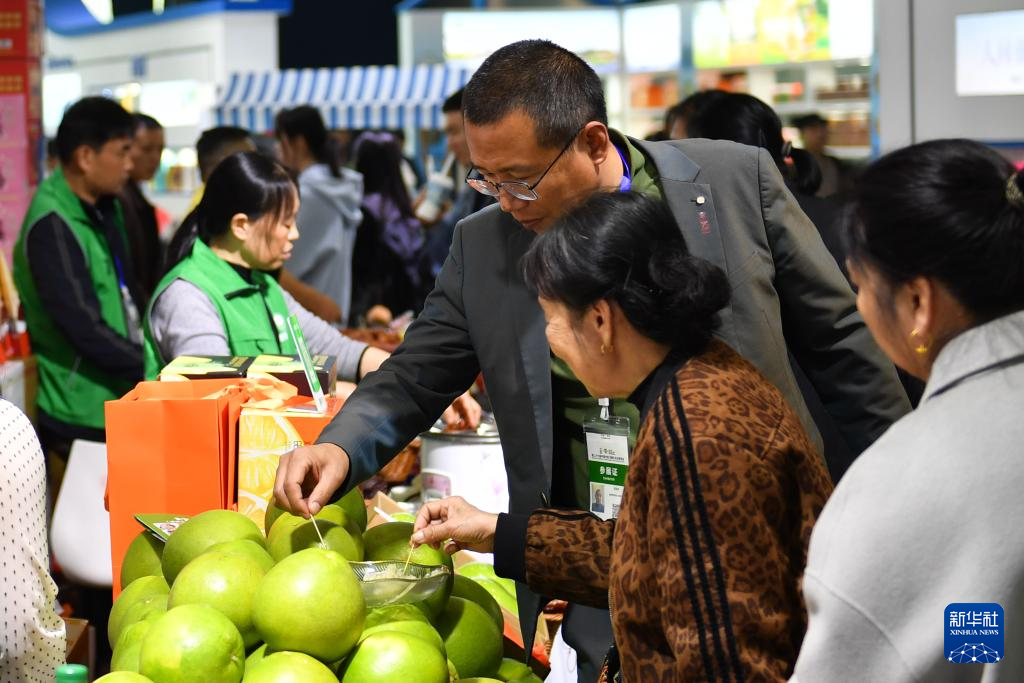 11月14日,观众(右)在第二十六届中国中部(湖南)农业博览会上挑选商品。