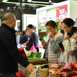 11月14日,观众在第二十六届中国中部(湖南)农业博览会上挑选商品。
