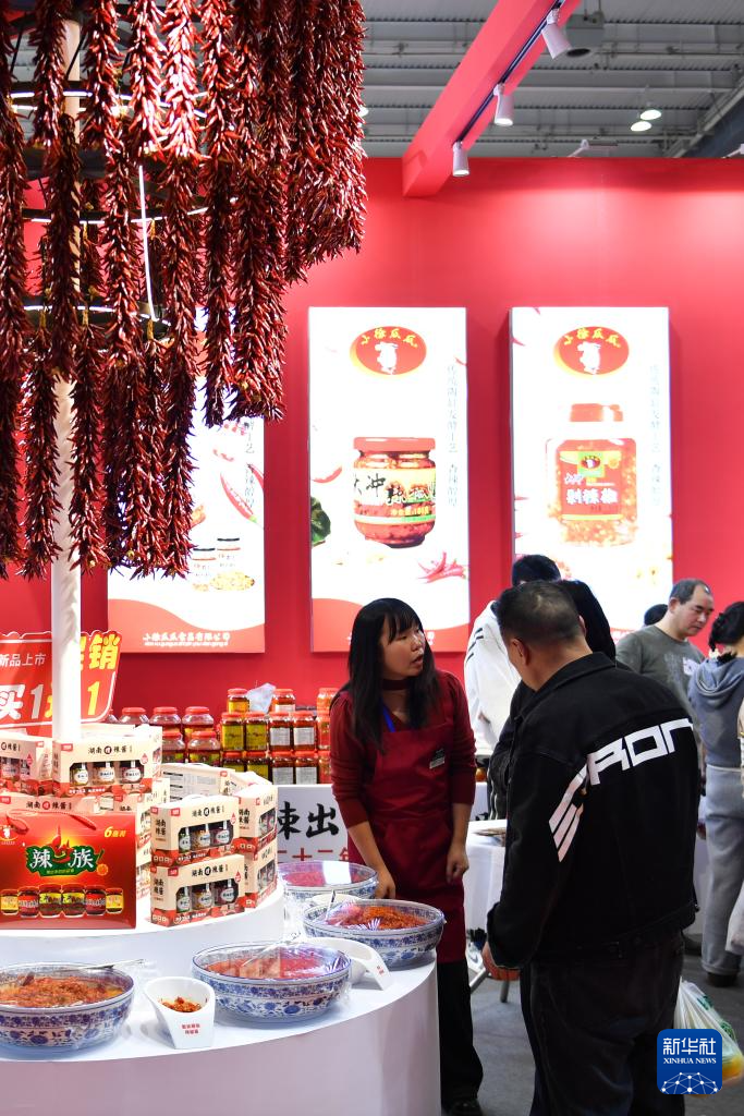 11月14日,在第二十六届中国中部(湖南)农业博览会上,参展商(左)向观众介绍商品。