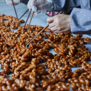 11月15日,义乌市城西街道上杨村铭悦红糖厂的工人将浓稠的糖蔗汁浇到麻花上,制成义乌的传统红糖美食——红糖麻花。