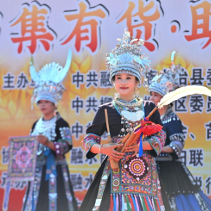 11月15日,在融水县融水镇苗家小镇社区,演员展示芦笙和苗绣。