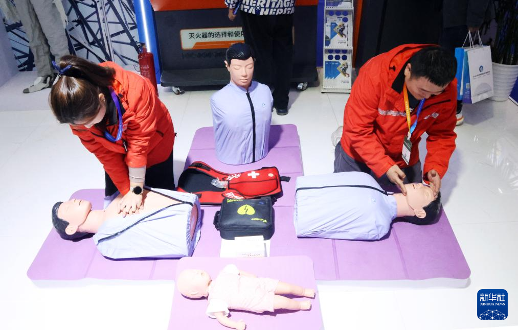 11月18日,工作人员在展览现场向观众演示紧急救护方法。