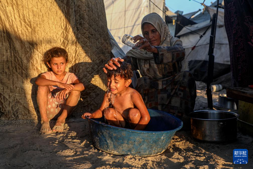 2025年7月18日,在加沙地带北部加沙城,巴勒斯坦儿童在临时帐篷外洗澡。