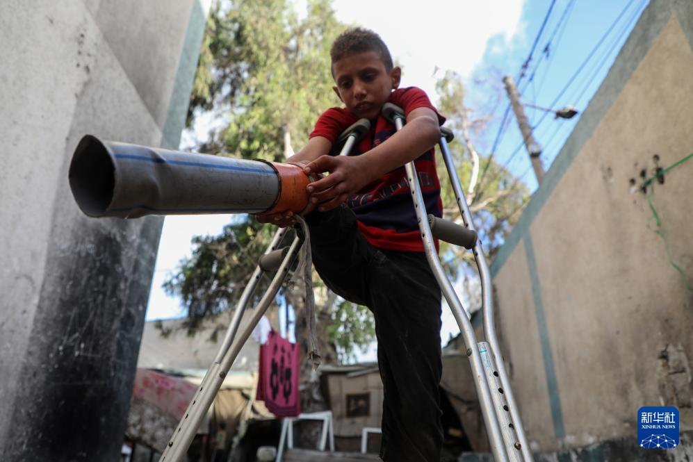 2025年10月5日,年仅10岁的少年拉提卜·阿布·卡里克在加沙地带中部代尔拜拉赫附近的联合国临时安置机构内拄着拐杖安装假肢。在数月前的一次以色列空袭中,拉提卜失去了右腿致残,他的母亲和兄弟在袭击中身亡。