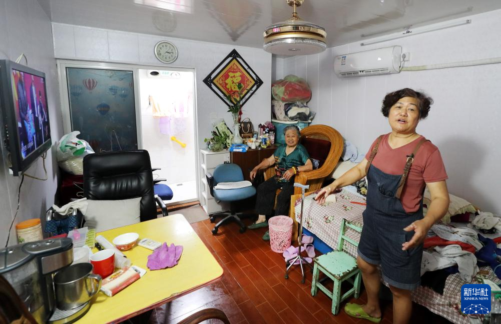 宝昌路731弄小区居民李才英(右)和她92岁的母亲在家中看电视,左后侧是她家完成改造的新卫生间(2019年7月18日摄)。
