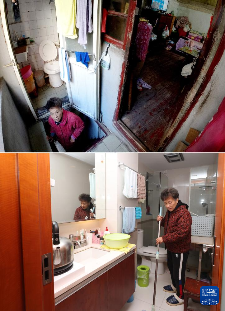 拼版照片:上图是改造前的漕溪三村小区居民共用厨房(资料照片,新华社发);下图是拆除重建后的漕溪三村小区室内独立厨房和卫生间(2025年10月23日摄,新华社记者方喆摄)。
