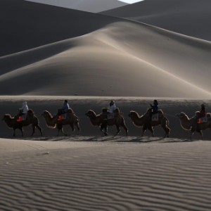 冬日时节,甘肃省敦煌市鸣沙山月牙泉景区暖阳高照,驼铃悠扬,景色如画,游客徜徉其中欣赏大漠风光,体验丝路风情。