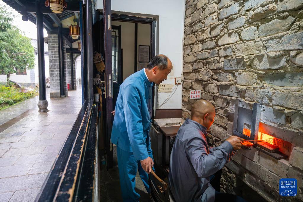 11月19日,在保山市永子文化园,李国伟(左)指导徒弟张佳林滴制永子。新华社记者 高咏薇 摄pagebreak