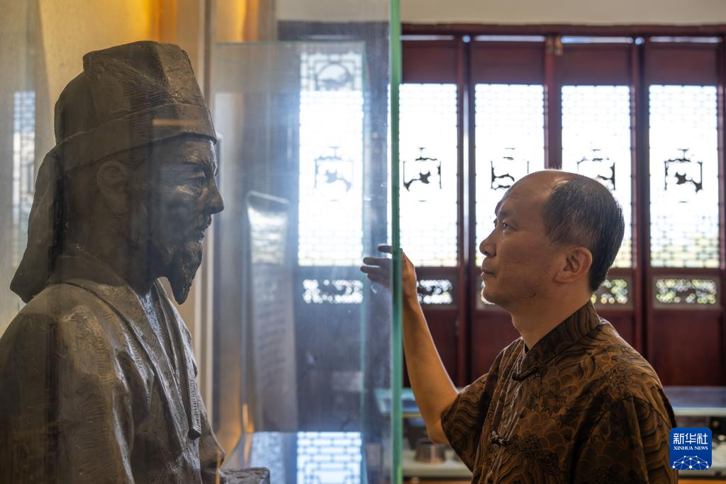 11月20日,在保山市永子棋院,李国伟注视李德章雕像。新华社记者 高咏薇 摄pagebreak