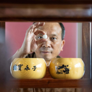 李国伟拾起新制出的永子,细数其妙:黑子并非纯黑,而是“黑如鸦青”,对光照视,边闪翠环,宛如秋水深潭;白子“白如蛋清”,呈象牙色,润糯如羊脂。经打磨后,色泽明而不炫,适合弈者长时间观看思考。执于手间,凸而不显,身扁而不觉其薄。轻落枰上,声铿而不脆,既提醒对手,又不扰思绪。当弈者举棋不定时,指尖的温度仿佛能够赋予永子生命,在静默中指引方向。