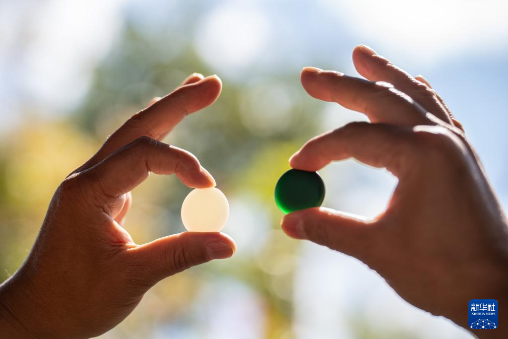 11月20日,在保山市永子棋院,李国伟查看永子的成色。新华社记者 高咏薇 摄pagebreak