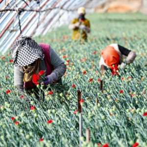 近日,宁夏银川市兴庆区各花卉基地的玫瑰、康乃馨、蝴蝶兰竞相绽放,工人忙着养护、采摘和包装花卉,供应市场。近年来,银川市兴庆区依托光照资源优势,发展特色花卉产业,通过建成农业高科技智慧示范园,提升花卉冬季生产能力。目前,兴庆区花卉种植面积7000余亩,带动4000余名农户就业,形成鲜切花、盆栽、绿化观赏苗木三大品种产业链,花卉产业年产值约1.6亿元。