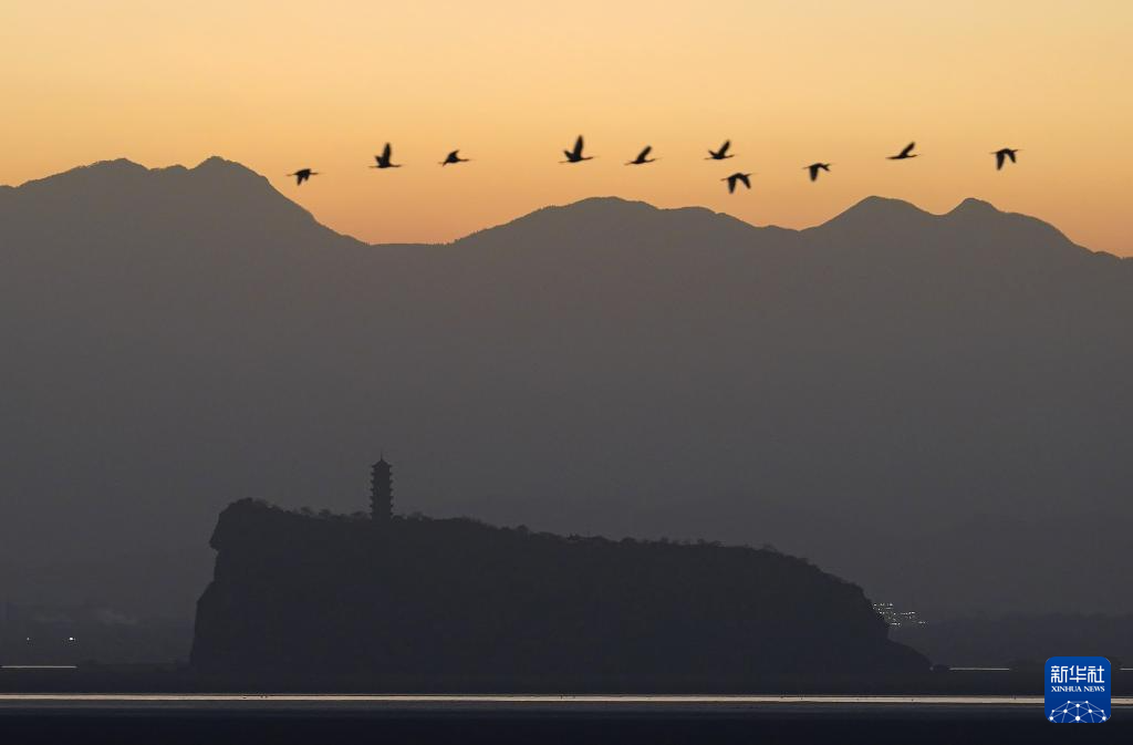 候鸟在江西省湖口县鄱阳湖鞋山水域飞翔(11月26日摄)。