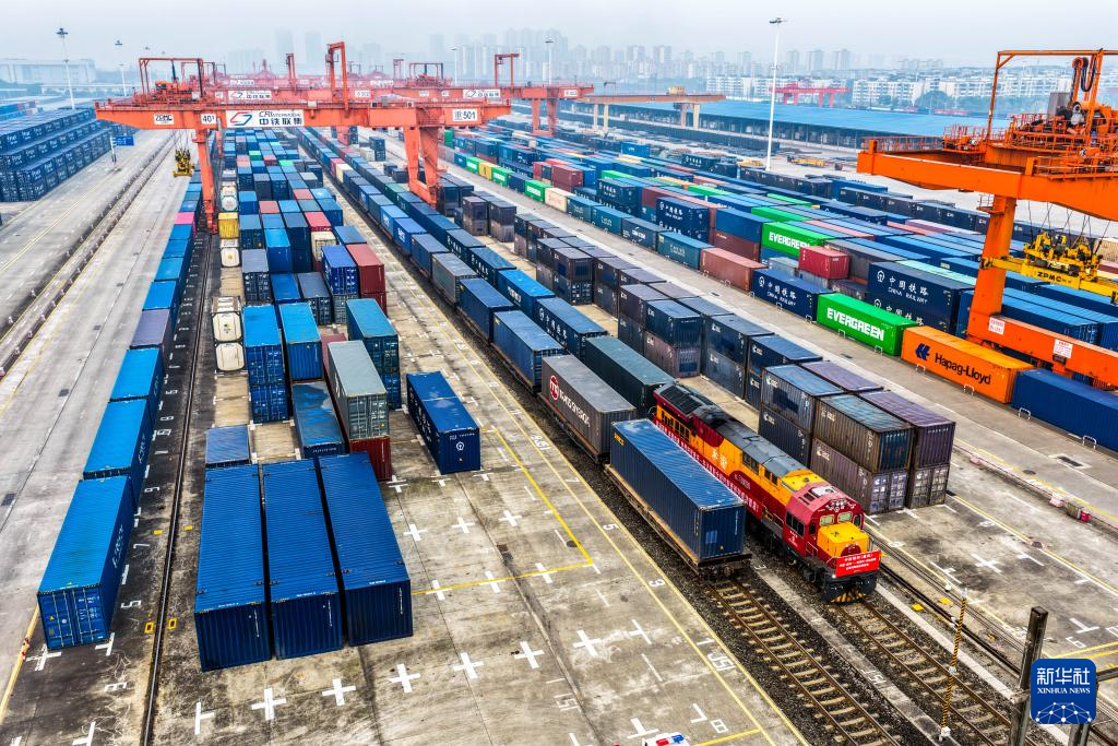 11月30日,重庆—匈牙利布达佩斯全程时刻表中欧班列在重庆团结村中心站顺利发车(无人机照片)。
