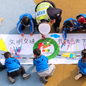 12月1日,浙江省湖州市长兴县水口乡中心幼儿园,长兴县公安局水口派出所交警中队工作人员与小朋友一起绘制交通安全主题画卷。