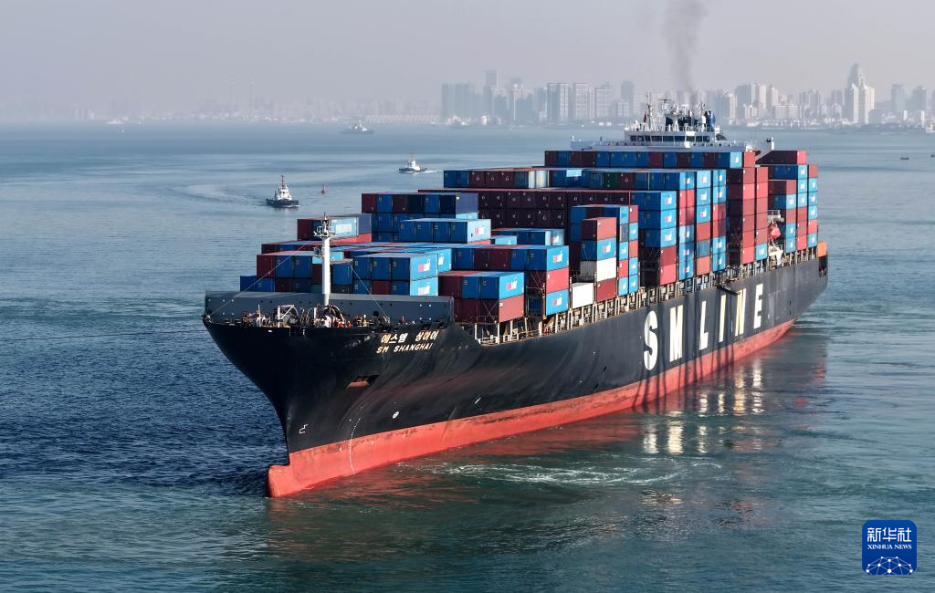 12月4日,一艘满载集装箱的货轮驶离青岛港前湾港区码头(无人机照片)。