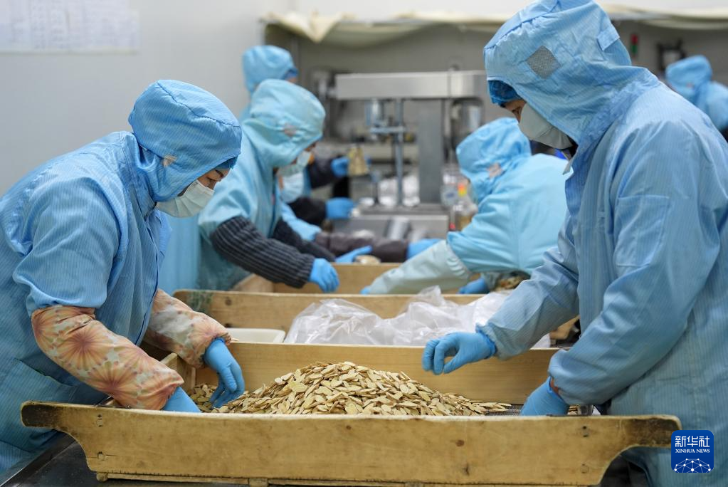 工作人员在宁夏固原市隆德县一家药材加工企业分拣黄芪(12月6日摄)。