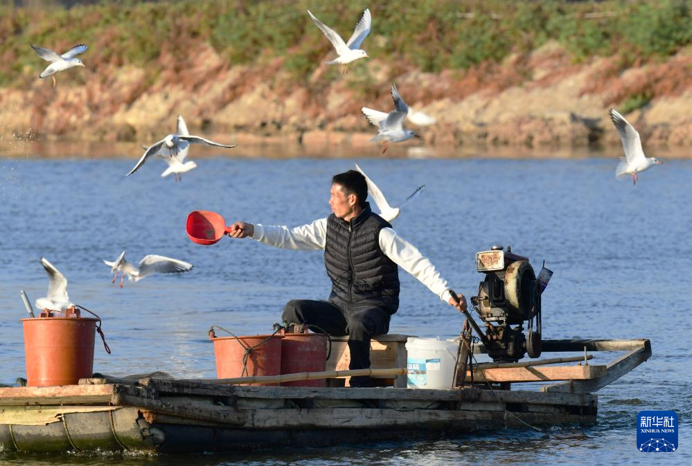 12月10日,东坂村河豚养殖户在给河豚投喂食物。