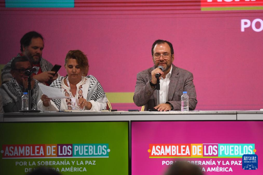 12月9日,委内瑞拉外交部长希尔(右)在首都加拉加斯举行的“美洲主权与和平人民大会”开幕式上发表讲话。