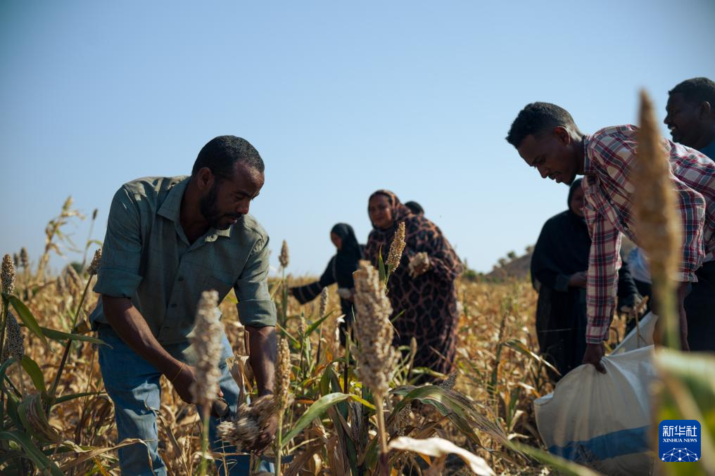 12月12日,在苏丹东部卡萨拉州瓦德希卢地区,农民在田间收获高粱。