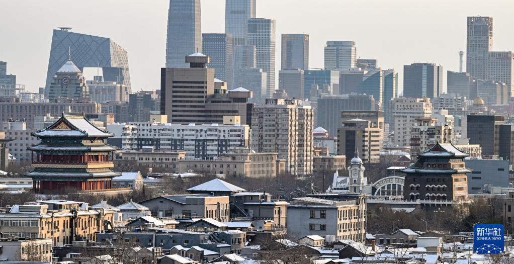 12月13日,雪后的北京正阳门城楼、正阳门箭楼和远处的CBD建筑群沐浴在晨光中。