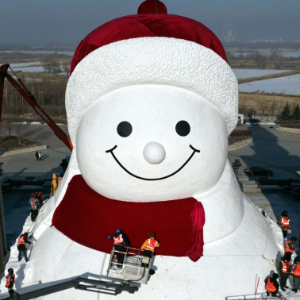 12月14日,正在建设中的哈尔滨群力音乐公园网红大雪人头部已完成,露出憨态可掬的笑容。今年回归的大雪人将在保留红帽子、红围脖、红色爱心纽扣“经典皮肤”的基础上,再次升级。设计身高19米、长14米、宽11米,比往年“长高”1米,总用雪量超过3000立方米,比往年增加1200立方米,达到历年之最。