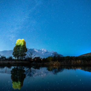 12月14日凌晨在云南省丽江市玉龙雪山脚下拍摄的双子座流星雨。