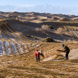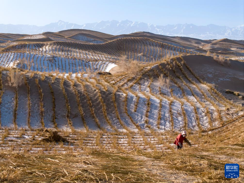 一场冬雪过后,在甘肃省酒泉市阿克塞哈萨克族自治县的库姆塔格沙漠边缘,施工人员忙着铺设沙障,有序推进甘肃省酒泉市祁连山北麓阿克塞片区水源涵养与生态保护修复项目。该项目总规模22.2万亩,包括工程固沙、封滩(沙)育林、人工造灌木林等防沙治沙项目。